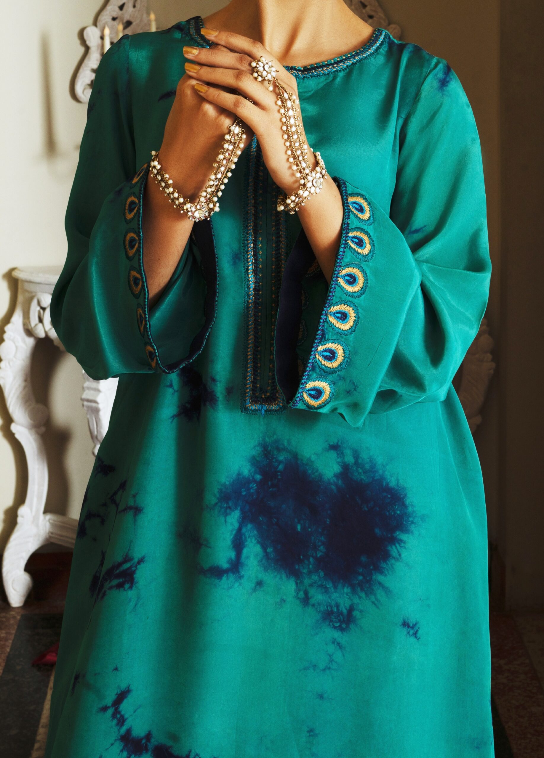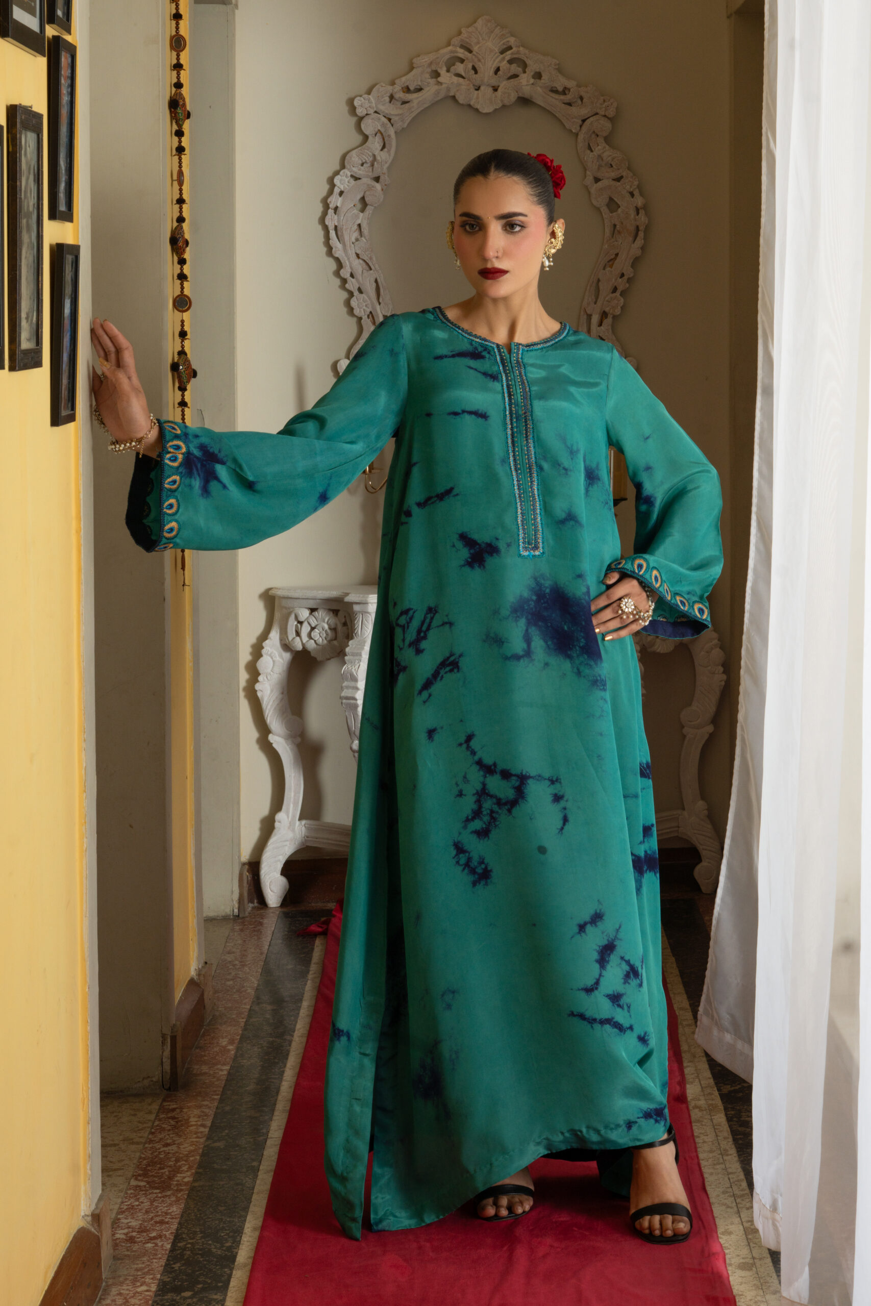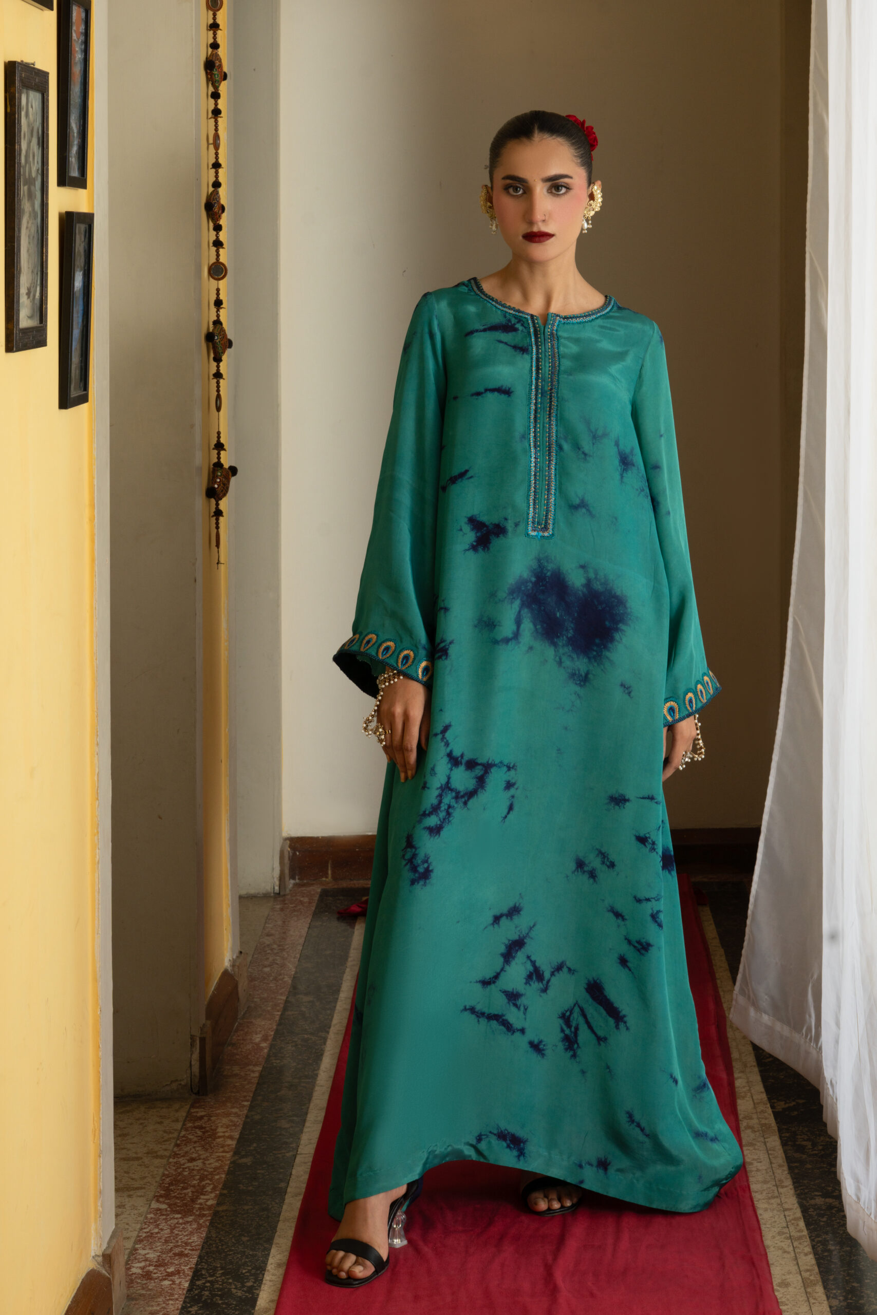 It features a stunning teal silk fabric with unique tie-dye accents in deep blue, creating an eye-catching and artistic pattern. The sleeves are beautifully detailed with peacock feather-inspired embroidery, showcasing intricate designs that add a regal touch. The dress is designed with a relaxed kaftan silhouette, perfect for the festive season.