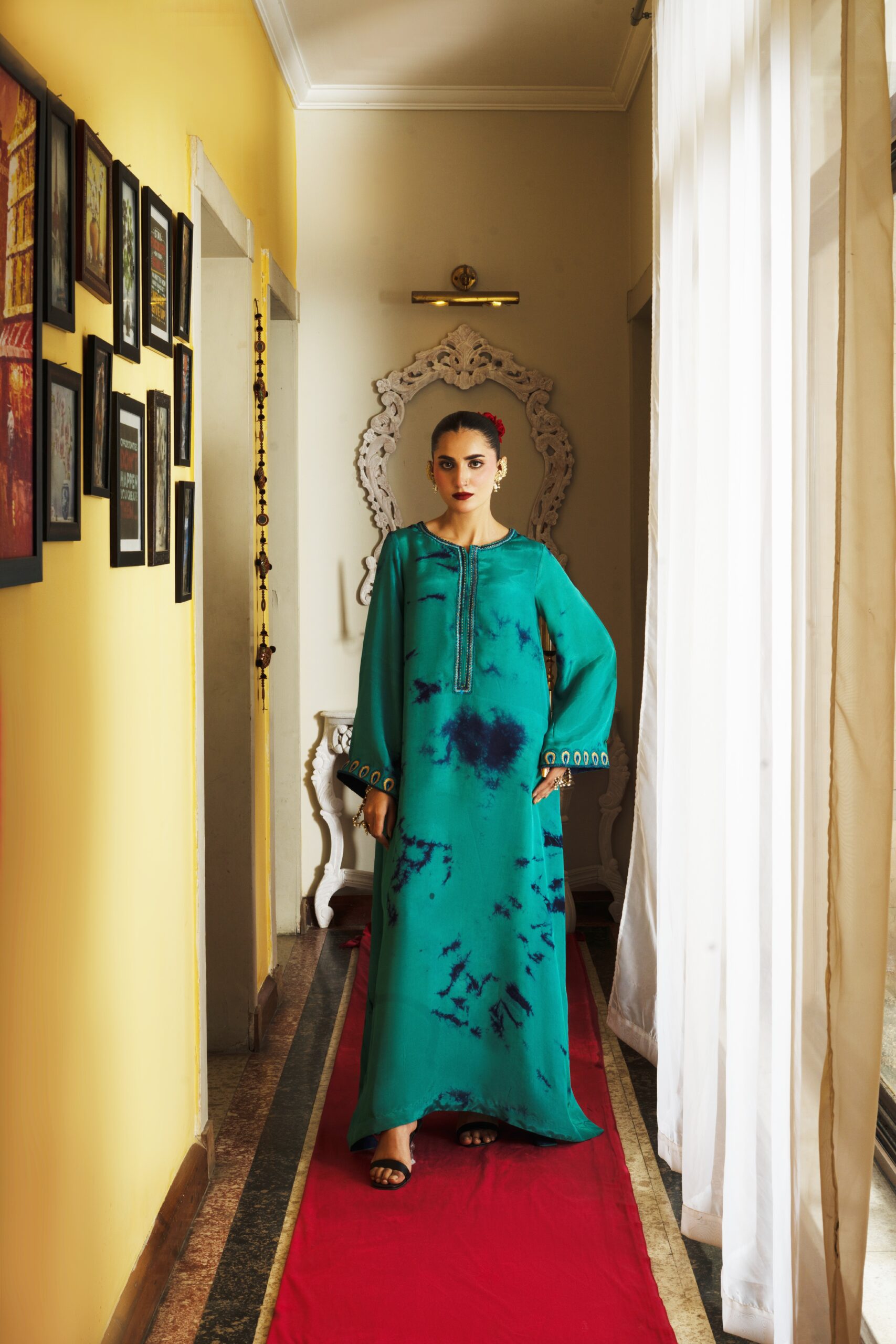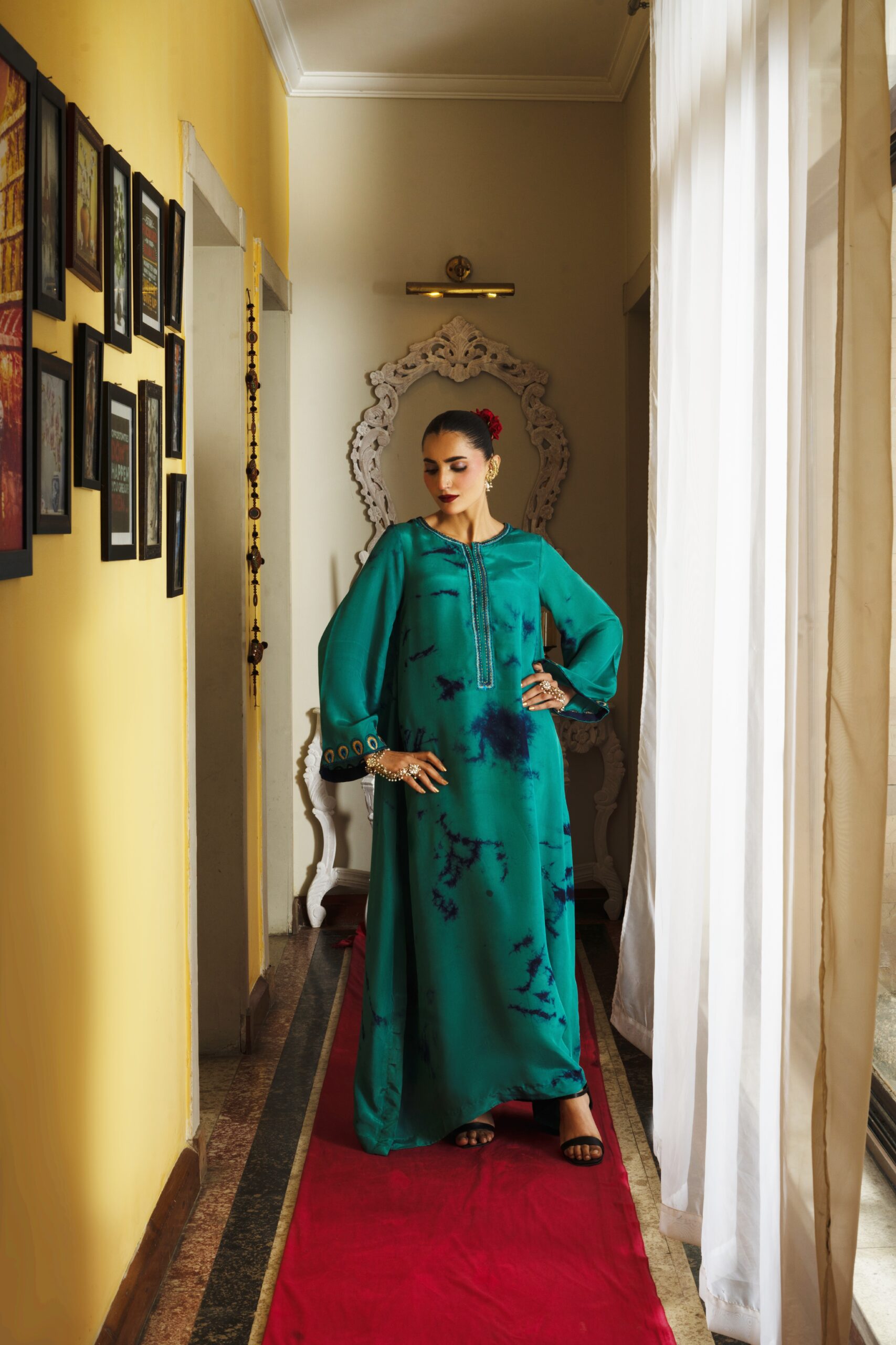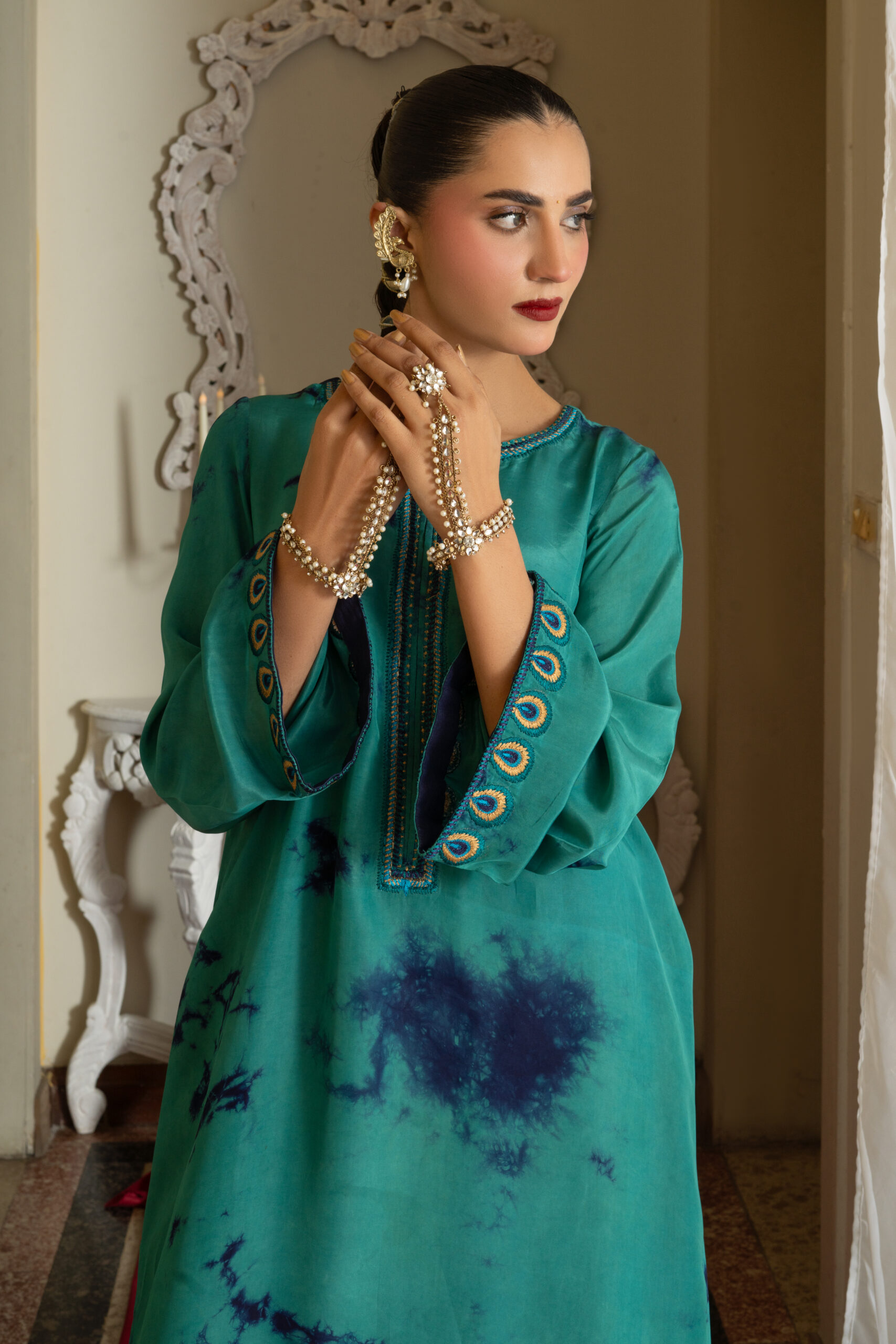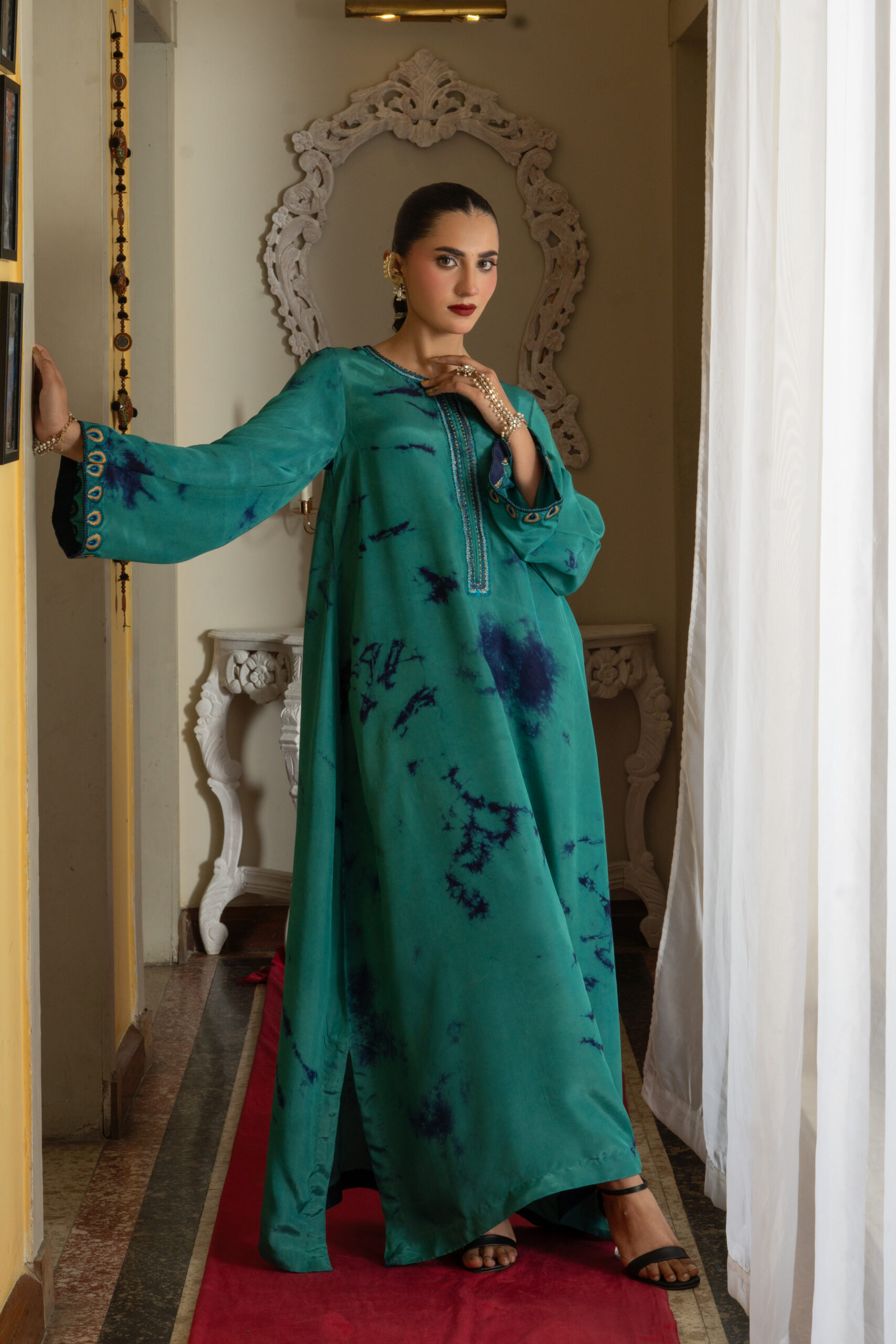 It features a stunning teal silk fabric with unique tie-dye accents in deep blue, creating an eye-catching and artistic pattern. The sleeves are beautifully detailed with peacock feather-inspired embroidery, showcasing intricate designs that add a regal touch. The dress is designed with a relaxed kaftan silhouette, perfect for the festive season.