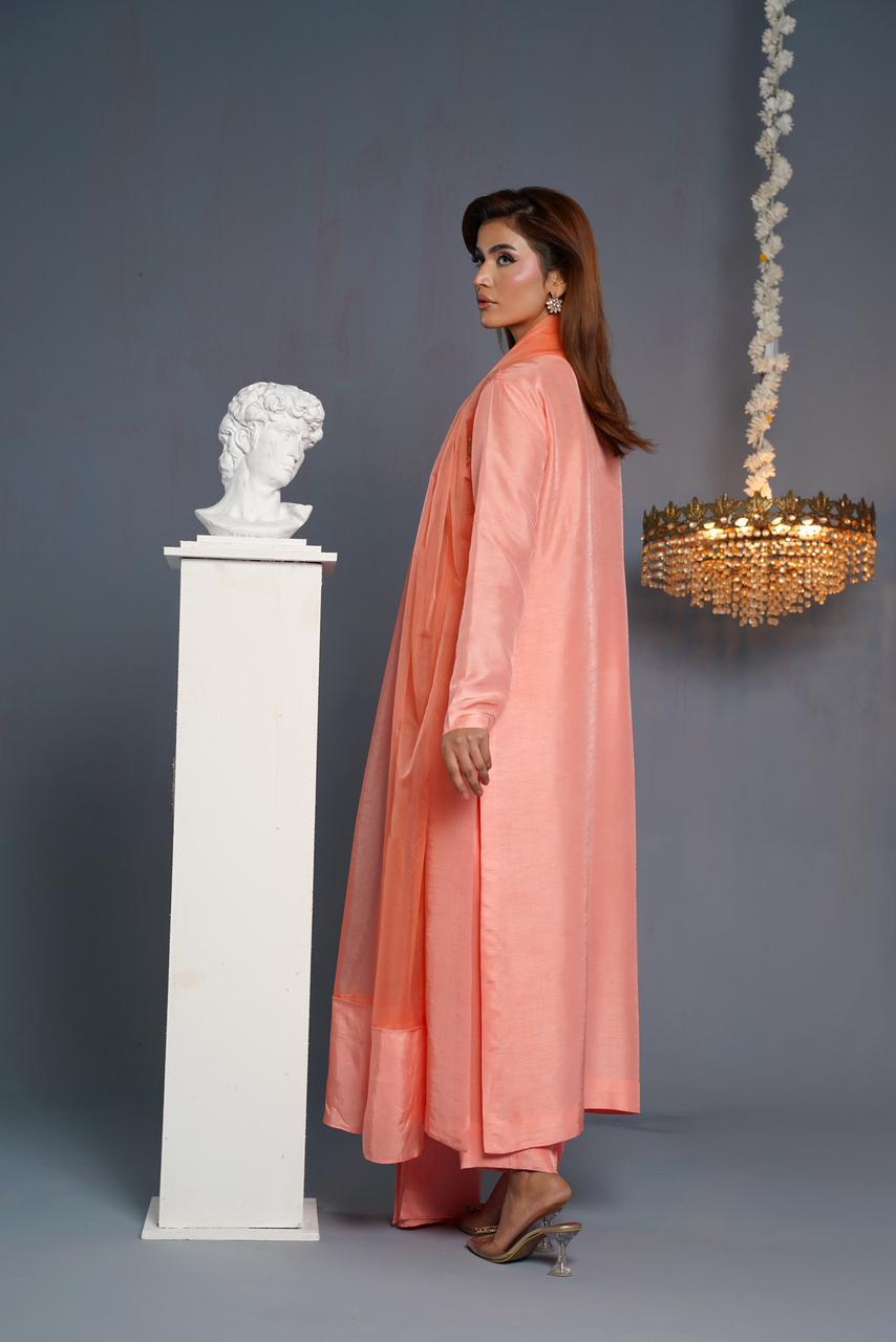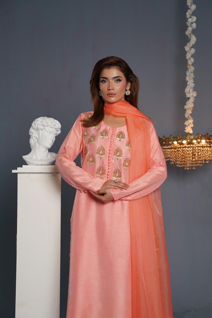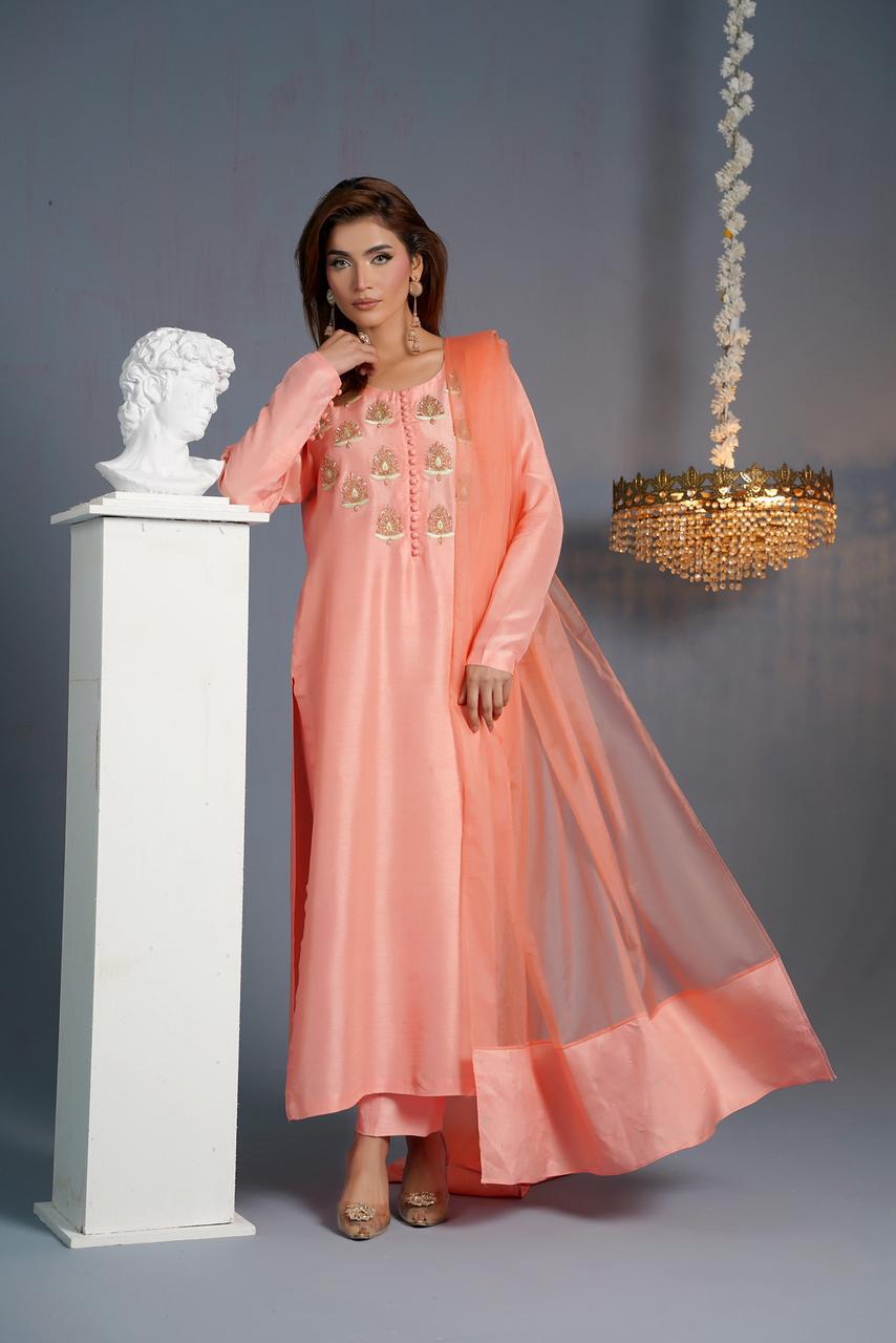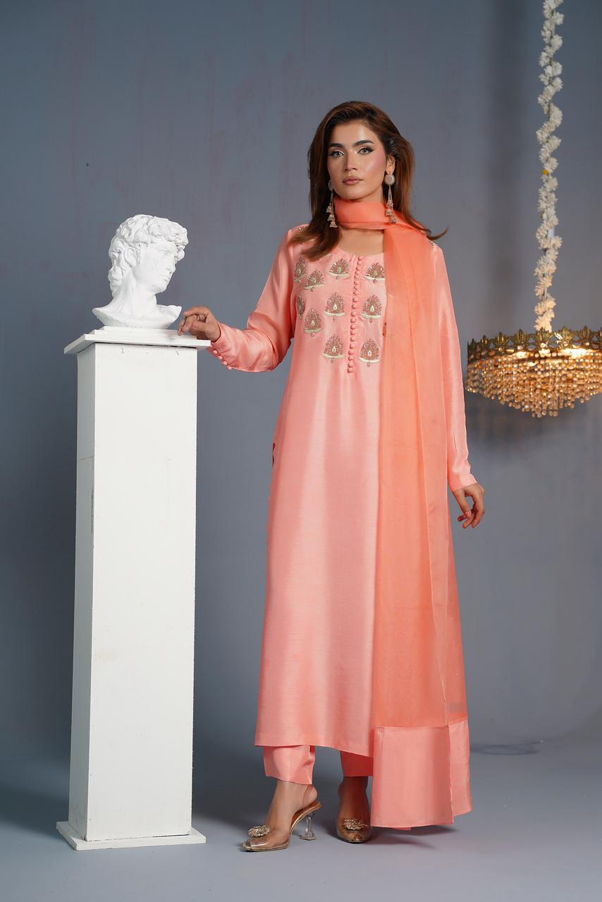 A premium peach Korean silk suit, adorned with delicate hand embroidery and intricate embellishments that exudes timeless elegance. Paired with a flowing organza dupatta and sleek straight pants, this dress is perfect for adding a touch of grace to your festive occasions.