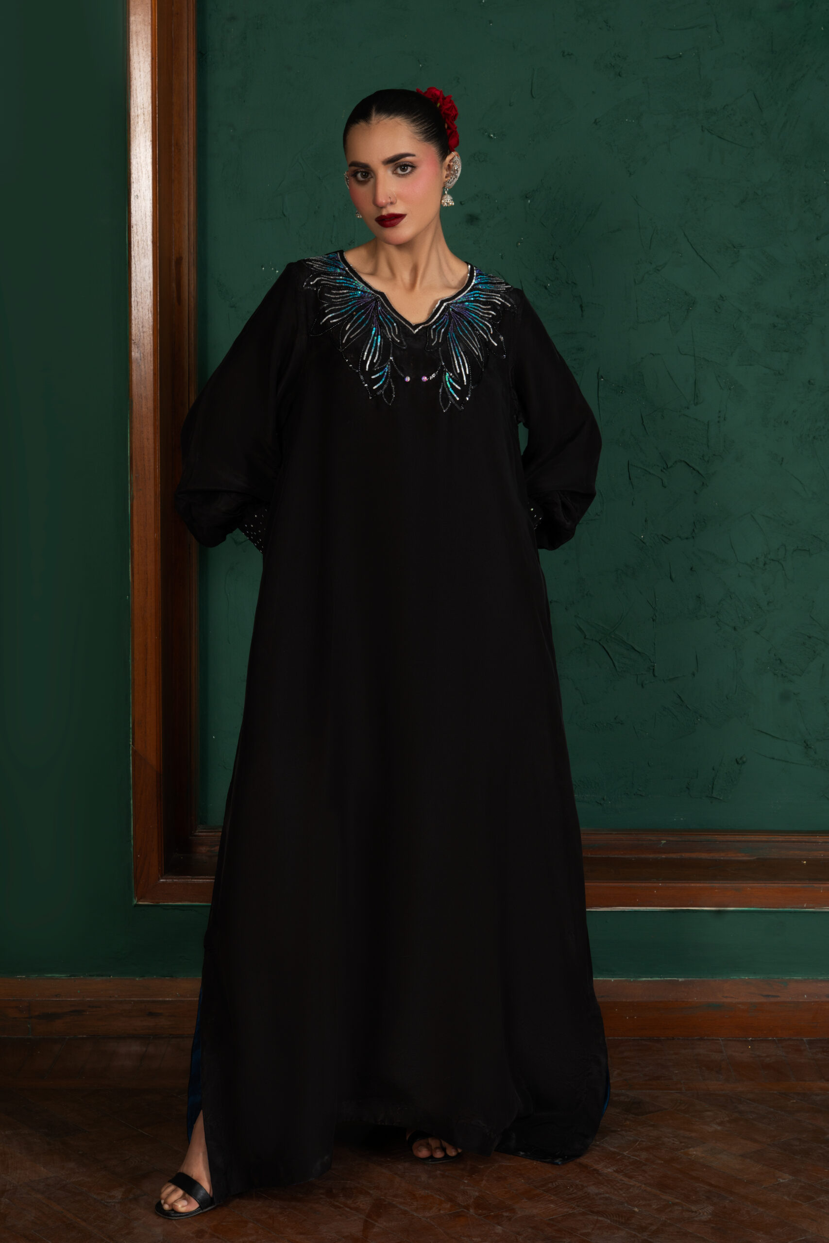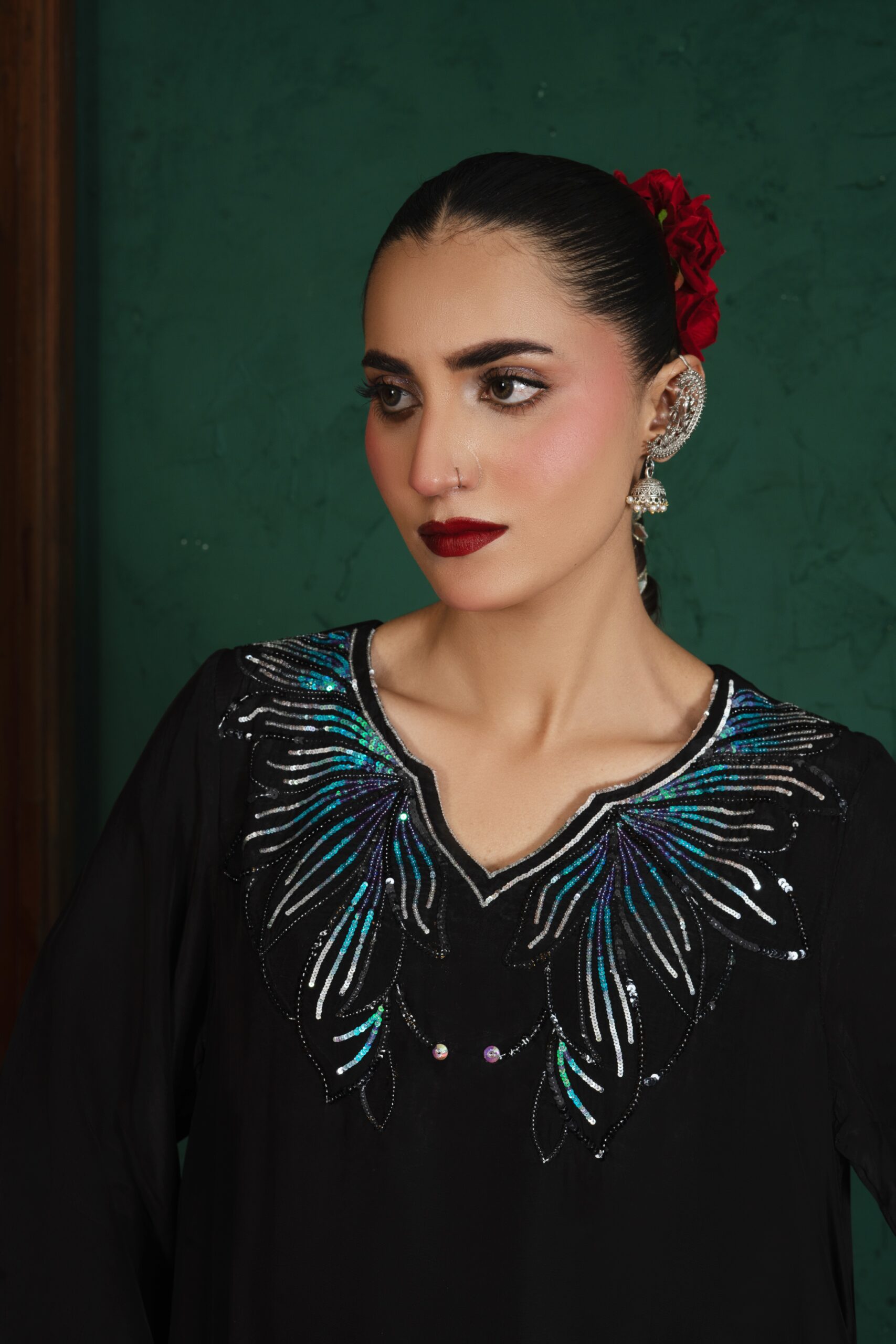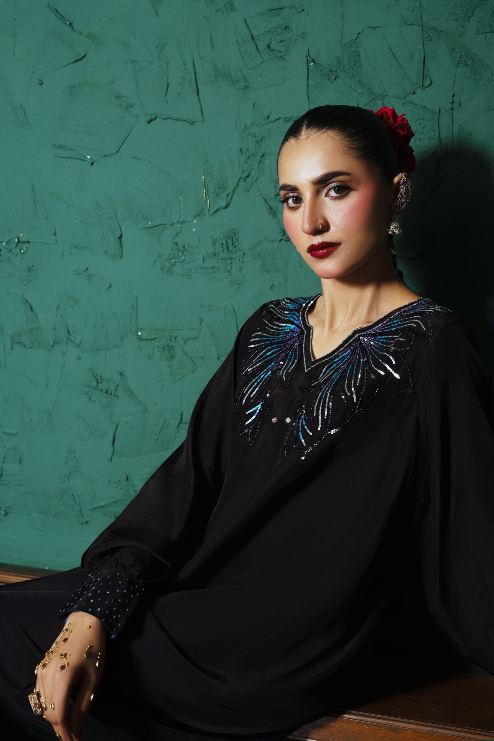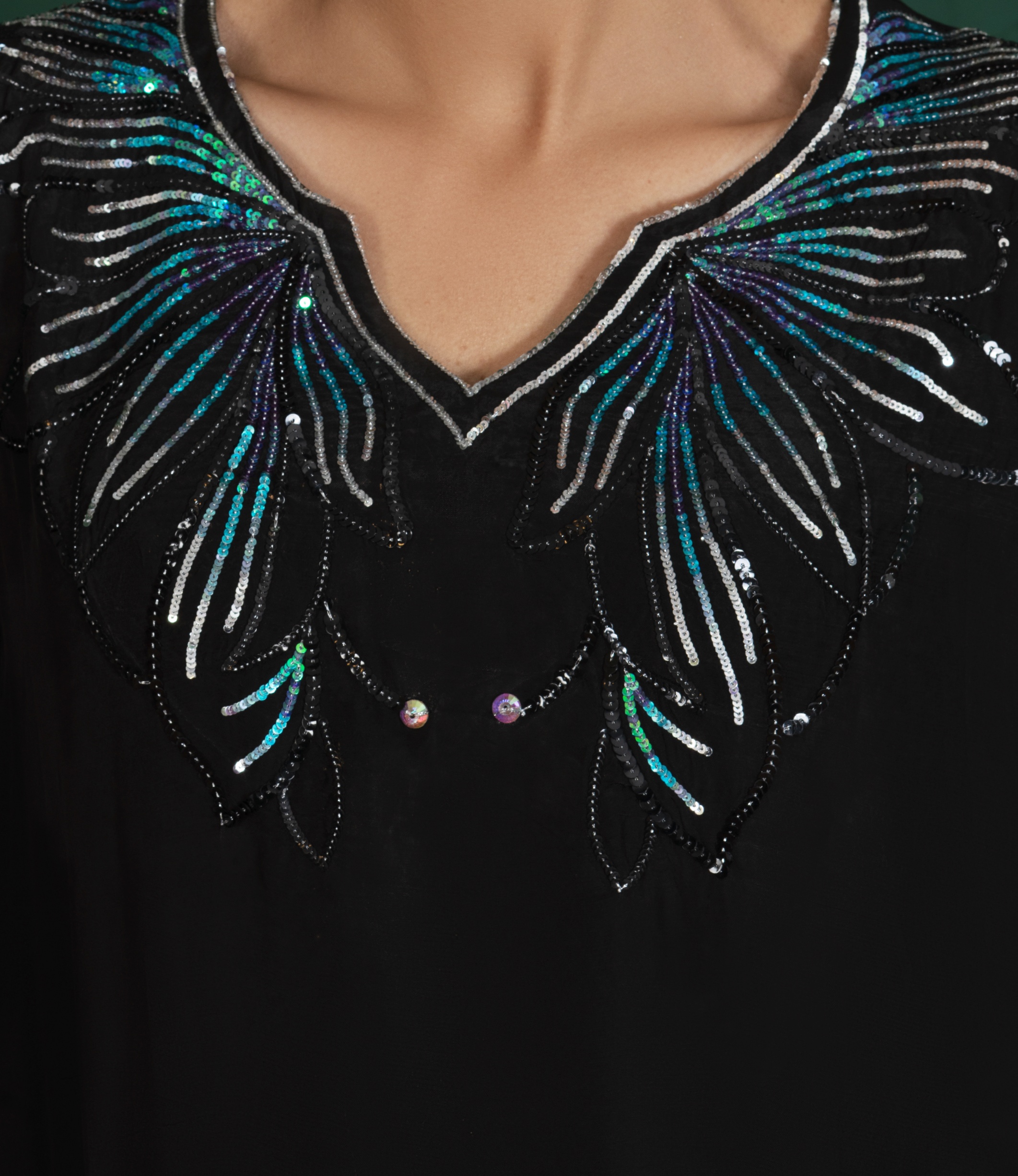 A chic black silk dress featuring vibrant peacock feather-inspired embroidery along the neck line. It is an ombre in blue, green, and silver sequin magic. The billowy sleeves are finished with cuffs adorned in a sequins shower, adding a touch of sparkle. The relaxed silhouette and side slits offer both elegance and movement, making it a perfect choice for festive or evening events.