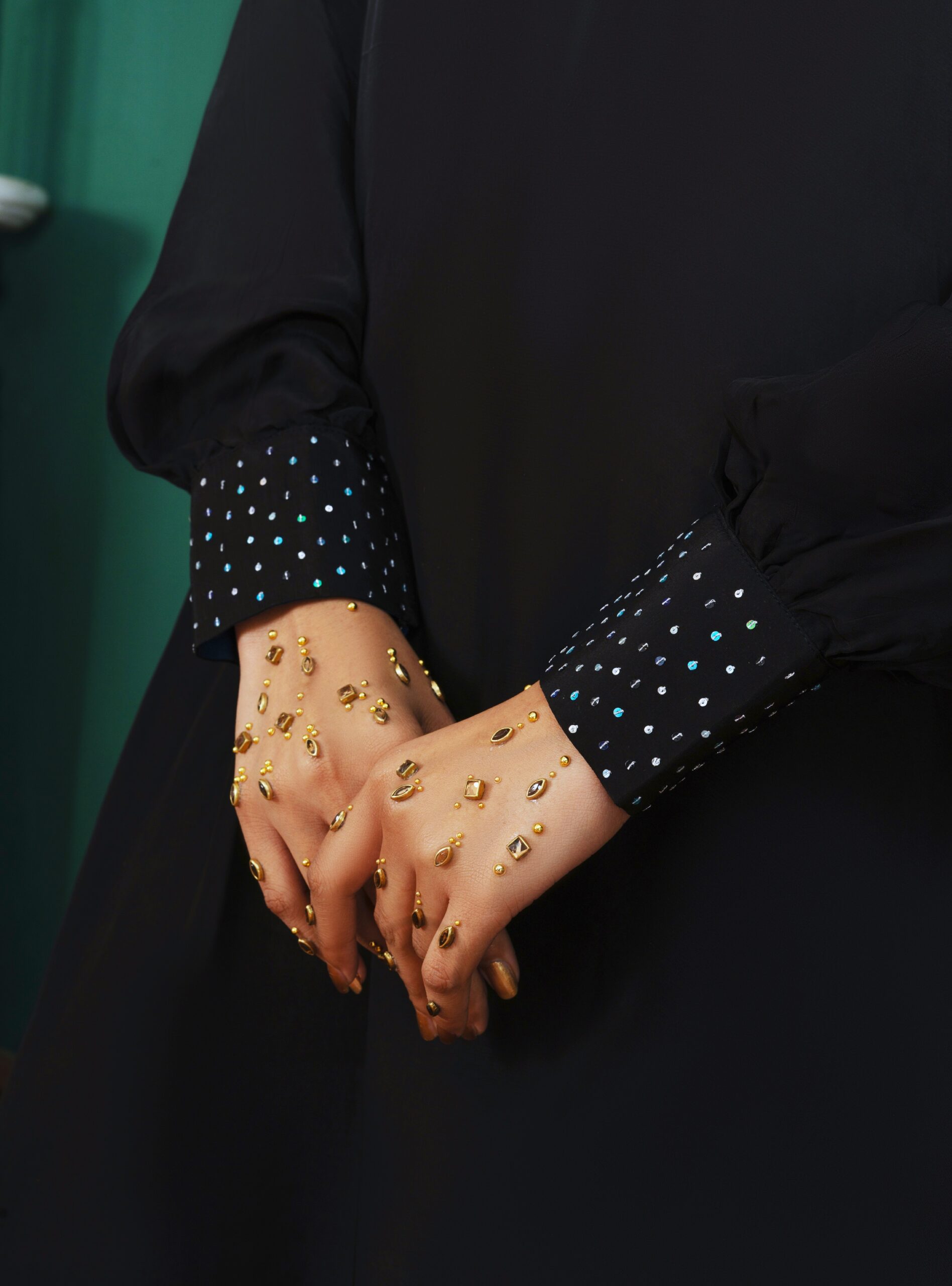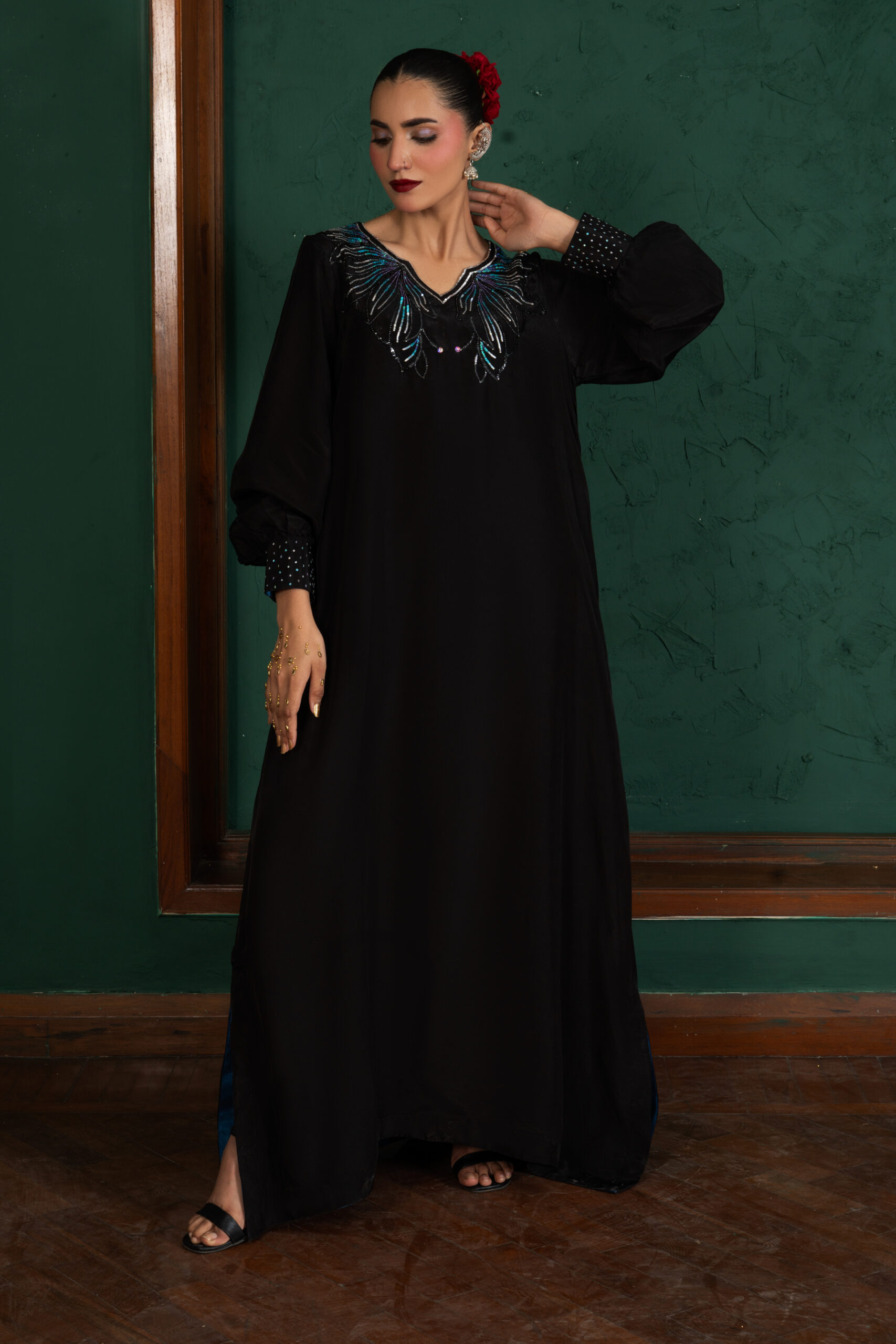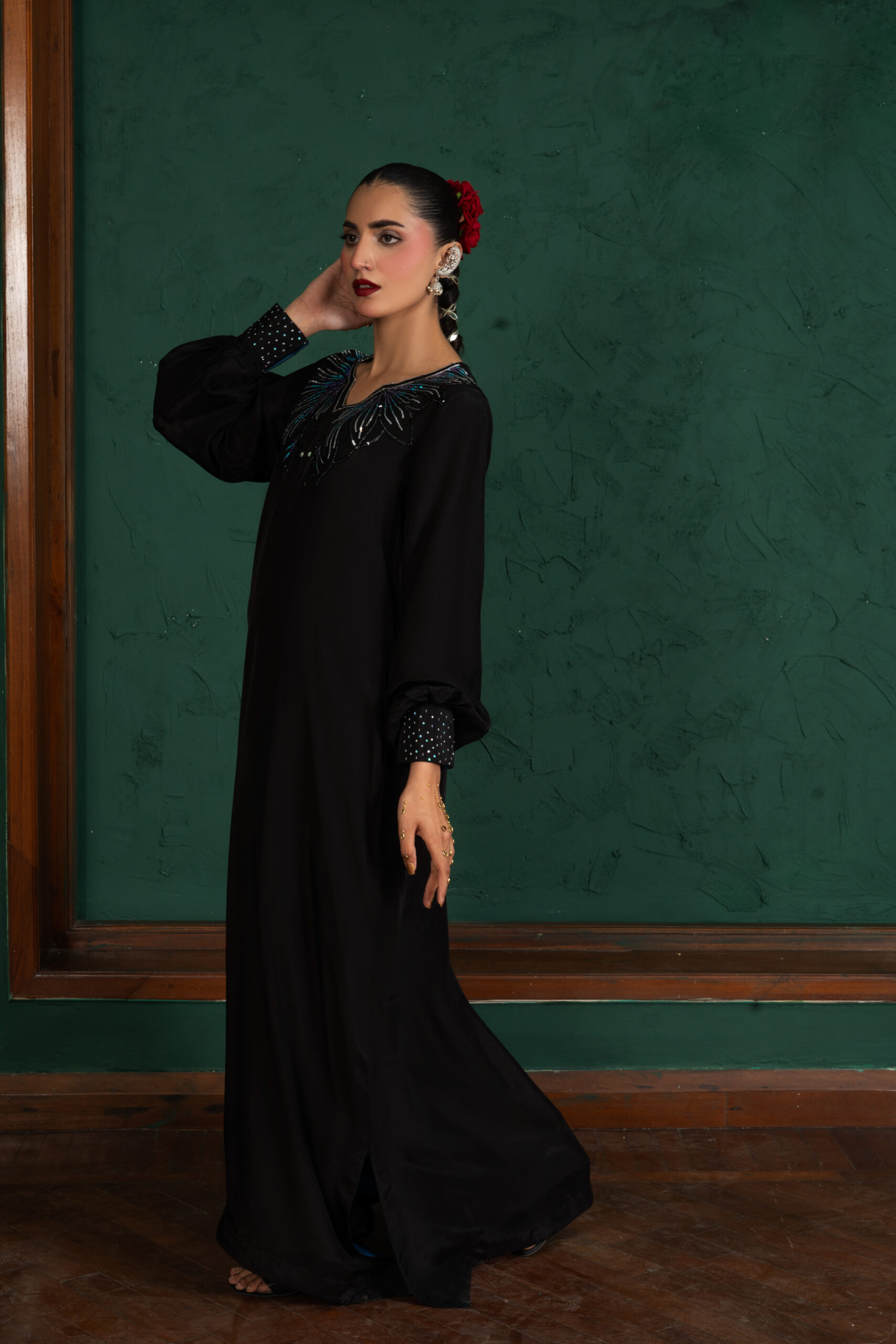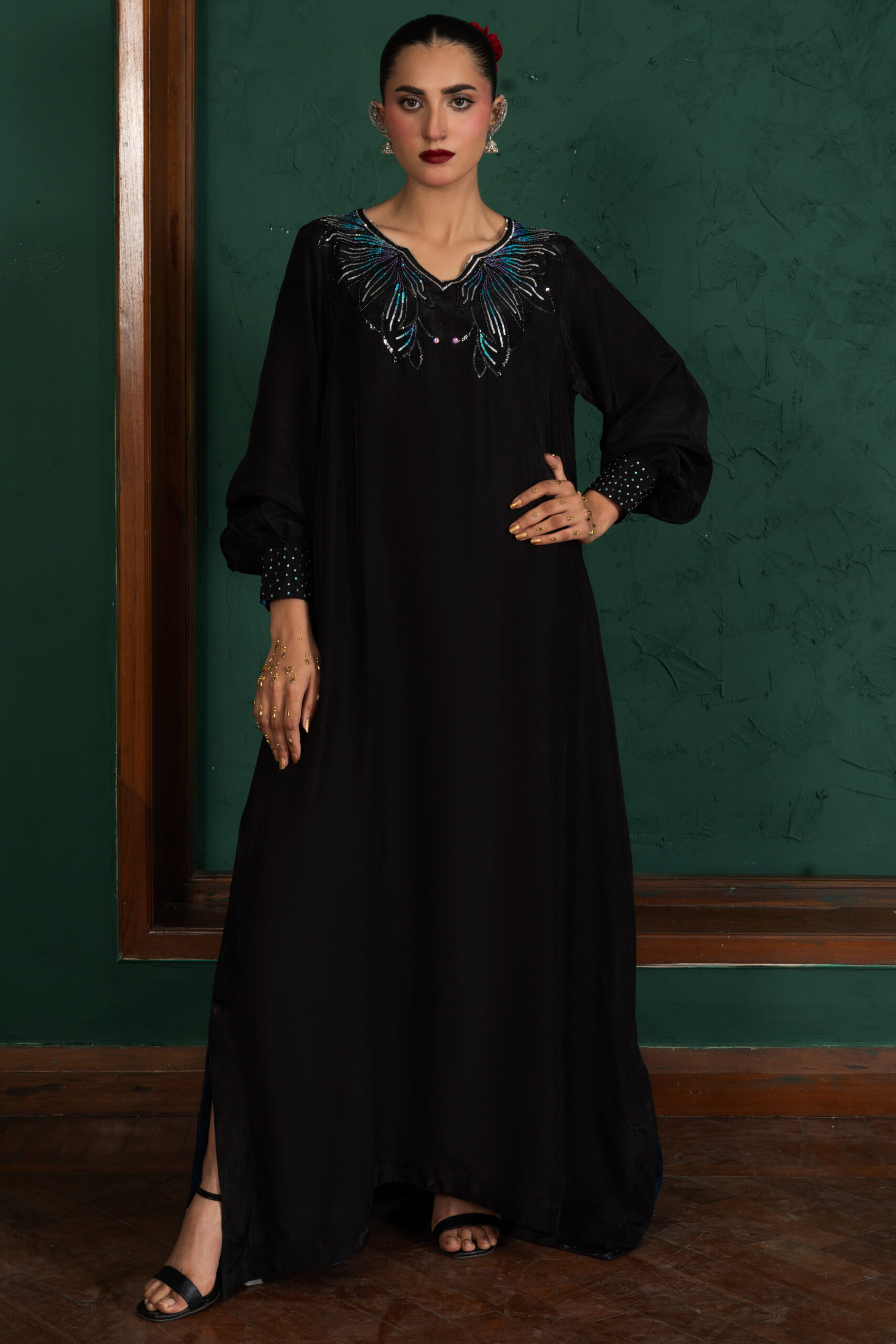 A chic black silk dress featuring vibrant peacock feather-inspired embroidery along the neck line. It is an ombre in blue, green, and silver sequin magic. The billowy sleeves are finished with cuffs adorned in a sequins shower, adding a touch of sparkle. The relaxed silhouette and side slits offer both elegance and movement, making it a perfect choice for festive or evening events.